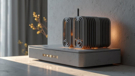 Futuristic wi-fi router on minimalist table in sunlit interior room. That the image is generated using AI.
