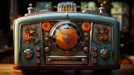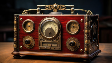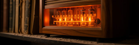 Vintage wooden radio with glowing vacuum tubes on dusty bookshelf. That the image is generated using AI.