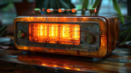 A vintage radio sits on a rustic wooden table, surrounded by flower pots. The warm glow of the radio lights adds a serene and nostalgic ambiance to a cozy interior space.