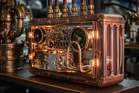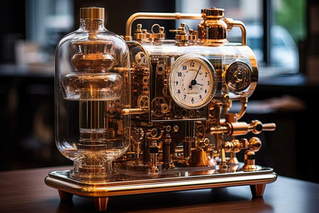 This captivating steampunk mechanism features intricate brass gears and tubes, highlighting the artistry and craftsmanship of vintage engineering in a workshop setting.