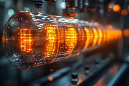 A futuristic scene showcasing an illuminated digital interface with glowing orange data points in a cylindrical glass structure. the image conveys themes of technology, innovation, and advanced data processing in a modern setting. Generative AI