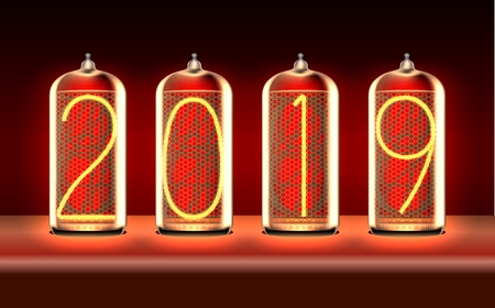 New Year greeting card with 2019 lit up in retro-styled nixie tube indicator lamps, includes transparency. Vector illustration.