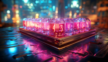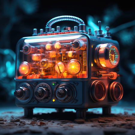 A captivating vintage display featuring neon glow in a laboratory setting. This image captures the elegance of technology and design, highlighting intricate electronics.