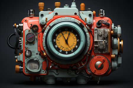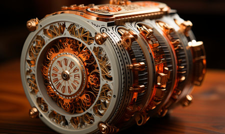 A detailed view of a clock placed on a table, showcasing its intricate design and precise time-display mechanism, A steampunk styled NAS system, AI Generated