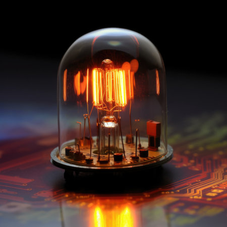 A detailed macro shot of glowing vacuum tubes arranged on a complex, detailed circuit board, illuminated with technicolor lighting, showcasing a blend of vintage technology and modern aesthetics.