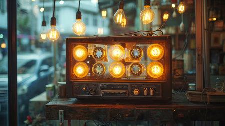 Retro-style tape deck adorned with sparkling light bulbs, emitting a warm and inviting glow, reminiscent of a bygone era Generative AI