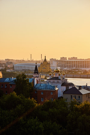 Golden-hour cityscape from Nizhny Novgorod Kremlin featuring the Kazaskaya Church and Alexander Nevsky Cathedral at the confluence of the Volga and Oka rivers