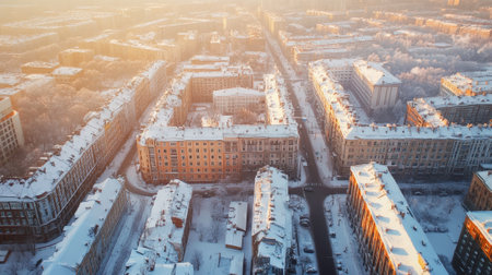 Capturing the serene beauty of urban life during winter, an aerial view reveals snow covered residential buildings in a cityscape at sunrise, highlighting peaceful rooftops and quiet streets