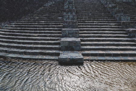 A vertical view of a descending boarding gate, a covered corridor with plenty of beams, on the quay for passengers of a boat or a ship, with river water in the background, selective focus in a middle