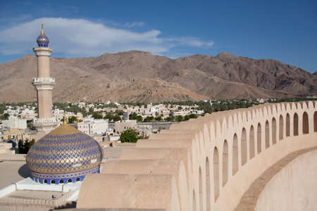 Nizwa town and old fort in Sultanate of Oman. Middle East, desert landscape, mountain and blue sky. Summer, sunny day, no body.