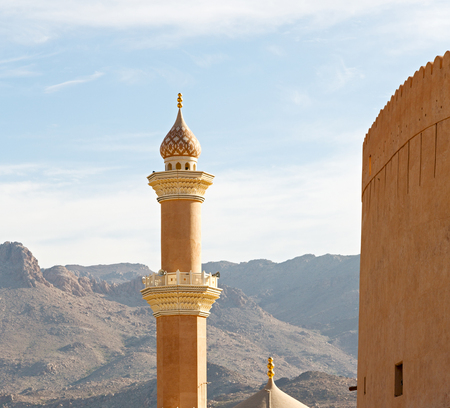 Minaret, dome and walls of medievel arabian fort of Nizwa, Oman. Hot day in arabian desert city.