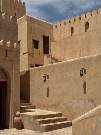 Nizwa town and old fort in Sultanate of Oman. The stone wall of the Fort and the stairs down which the Arab descends. Middle East, desert landscape, mountain and blue sky. Summer, sunny day.