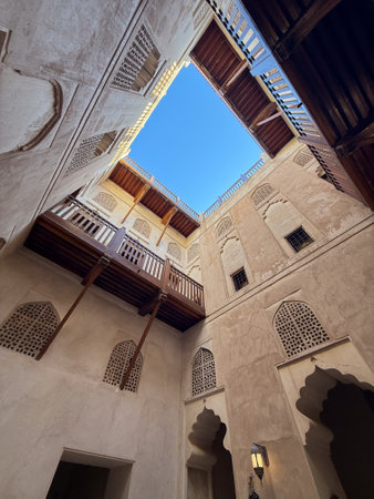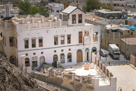 Muscat, Oman - 04.04.2018: Traditional old house in arabian style in the old city of Muscat on a hot day. Terrace on the roof.