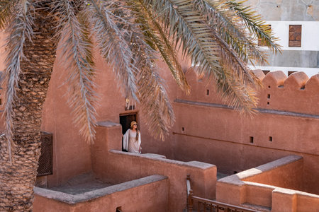 Tourist woman exploring ancient nizwa fort in oman under palm tree