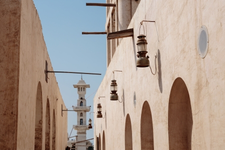 Doha,Qatar - April 15,2022 : Qatari locals in traditional attire hang out in old bazaar market Souk Waqif.