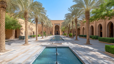 Stately Elegance of Serene Riyadh Waterway near National Museum, Lush Date Palms and Summer Light
