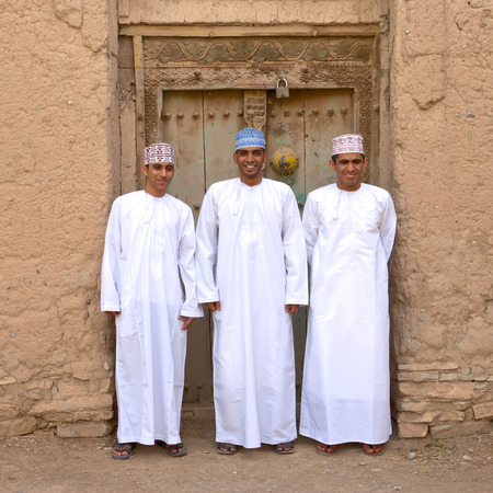 BIRKAT AL MOUZ, OMAN ? FEBRUARY 2, 2008: Three young Omani men in traditional dress at the ruins of Birkat Al Mouz in the Nizwa area of the Sultanate of Oman.