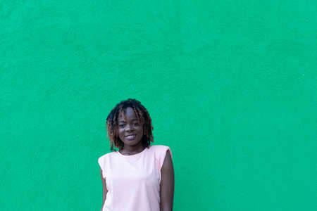 Lifestyle with a young trap dancer with braids in the city. Black Race Girl African Ethnicity With Orange T-Shirt And Cowboy Pants, Vertical Photo