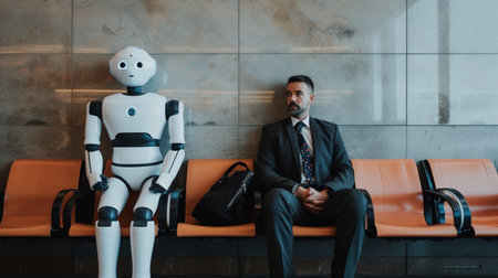 concerned business man and robot with business bag sitting and waiting in waiting room