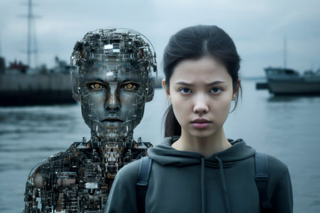 Conceptual portrayal: woman and sinister robotic male, representing the future of human-machine relations in AI era