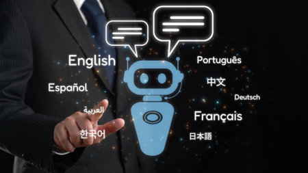 This image features a modern robot design representing AI language translation and prompt engineering concepts, emphasizing multilingual communication in a business context.