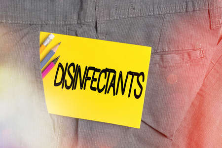 Writing note showing Disinfectants. Business concept for chemical that destroy vegetative form of harmful microorganism Writing equipment and yellow note paper inside pocket of man trousers