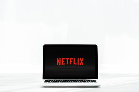 KYIV, UKRAINE - JULY 23, 2019: modern laptop with netflix website on screen on white