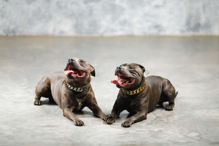 Picture of sweet American Staffordshire Terrier dog looking to side, sitting and wearing a leash at neck against gray studio background