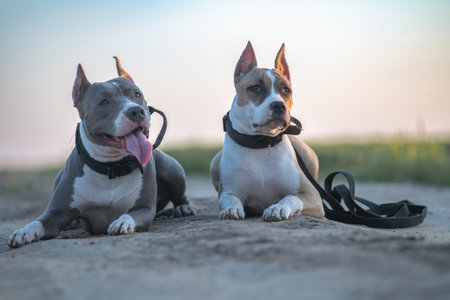 Two adult American Staffordshire Terrier Dogs Sitting together and touching paws on Isolated Black Background, front view