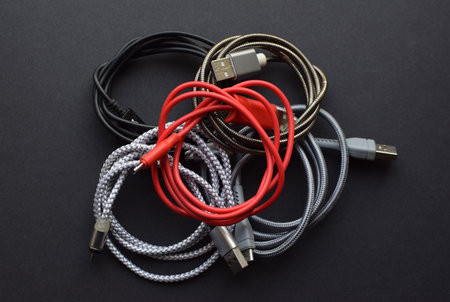 Multiple USB peripheral cables (Universal Serial Bus). USB data and power cables on a dark background. USB cable, charger. Close-up.
