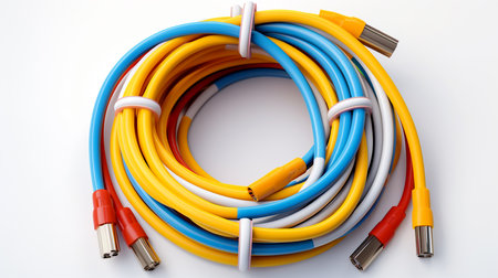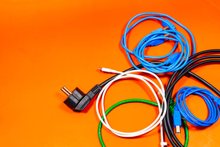 Discover a vibrant collection of charging cables and USB connectors arranged neatly on a wooden surface, perfect for tech enthusiasts and creative projects.