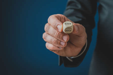 Businessman holding a wooden dice with yes and no words. Over blue background.