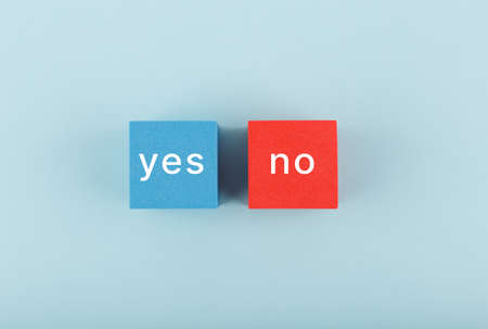 Yes and no written on blue and red toy cubes. Concept of positive and negative answer