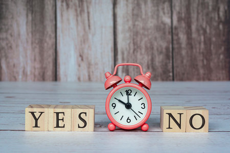 Yes No text on wooden block cube with alarm clock set at 10 o'clock on wooden background. Yes or No decision making. Choosing and answer.
