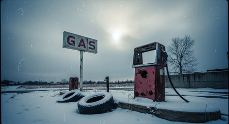 An isolated gas station at night, its signage glowing dimly, surrounded by a quiet, empty road.