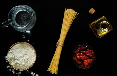 Italian food background or pasta ingredients on a black background, natural light, top view, free space for text