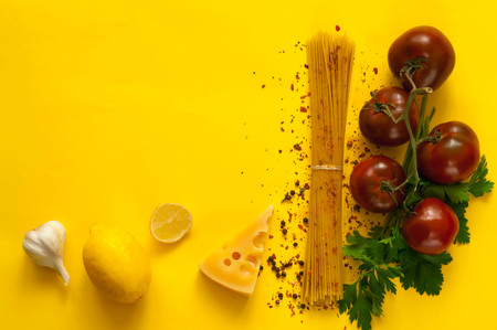 Set of products for cooking traditional italian pasta. Raw ingredients - spaghetti, cheese, tomatoes, garlic, olive oil, and seasonings.