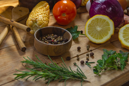 Healthy food herbs Spices for use as cooking ingredients on a wooden background with Fresh organic vegetables on wood. The concept of food ingredients with Variety on the rustic table.
