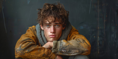 A young man from Russia gazes directly at the viewer with striking blue eyes. Tousled hair and relaxed expression. Introspection and tranquility. Portrait of a handsome man of 30 years. Generative AI.