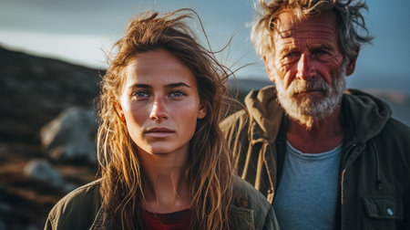 Portrait of senior man and young woman looking at camera while hiking in mountains