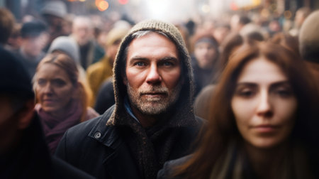 Bearded man in a crowd of people. AI generative.
