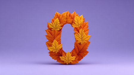 A beautiful arrangement of autumn leaves forms the number zero, showcasing vibrant orange and yellow hues against a soft purple background, perfect for seasonal themes.