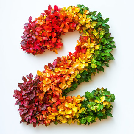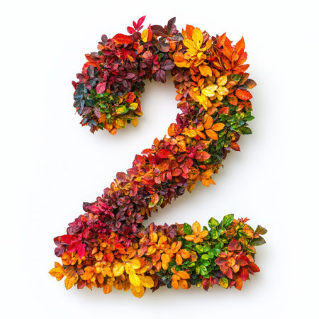 Number 2 made of fall leaves, flowers. berries. Vibrant autumn colours. White clean background. Generative AI.