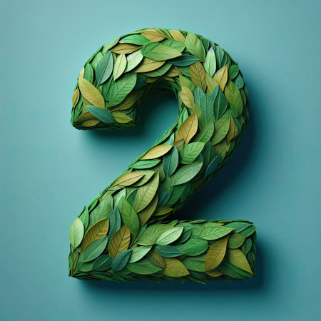the number 2 made out of leaves, on a teal background, photorealistic