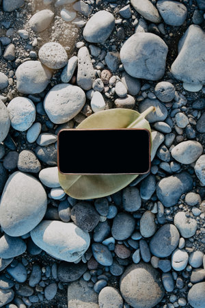 A phone on a leaf of a summer tree, a place for your website and advertising. Summer mokup on the beach on the stones
