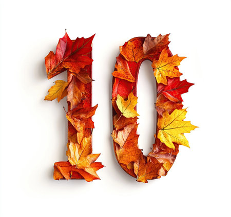 Number 10 made from autumn leaves on white background. 3d