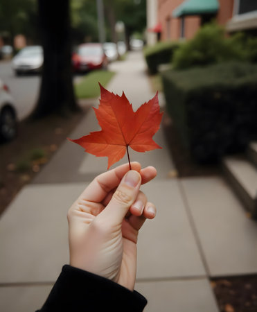 A vibrant red maple leaf held in a hand with an urban sidewalk and buildings in the background during the fall season outdoors