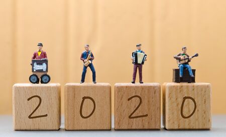 Miniature figure music band standing on wooden block with 2020 new year words concepts