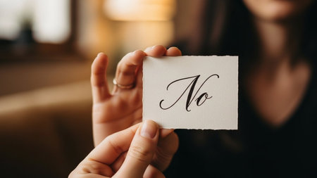The image depicts a close-up view of a person's hand holding a small piece of paper with the word 'No' written on it. The hand appears to be in a well-lit indoor setting, possibly a room with wooden furniture in the background. The focus is on the hand and the note, emphasizing the word 'No'.