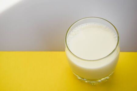 a glass almond of milk on the white and yellow background copy space
